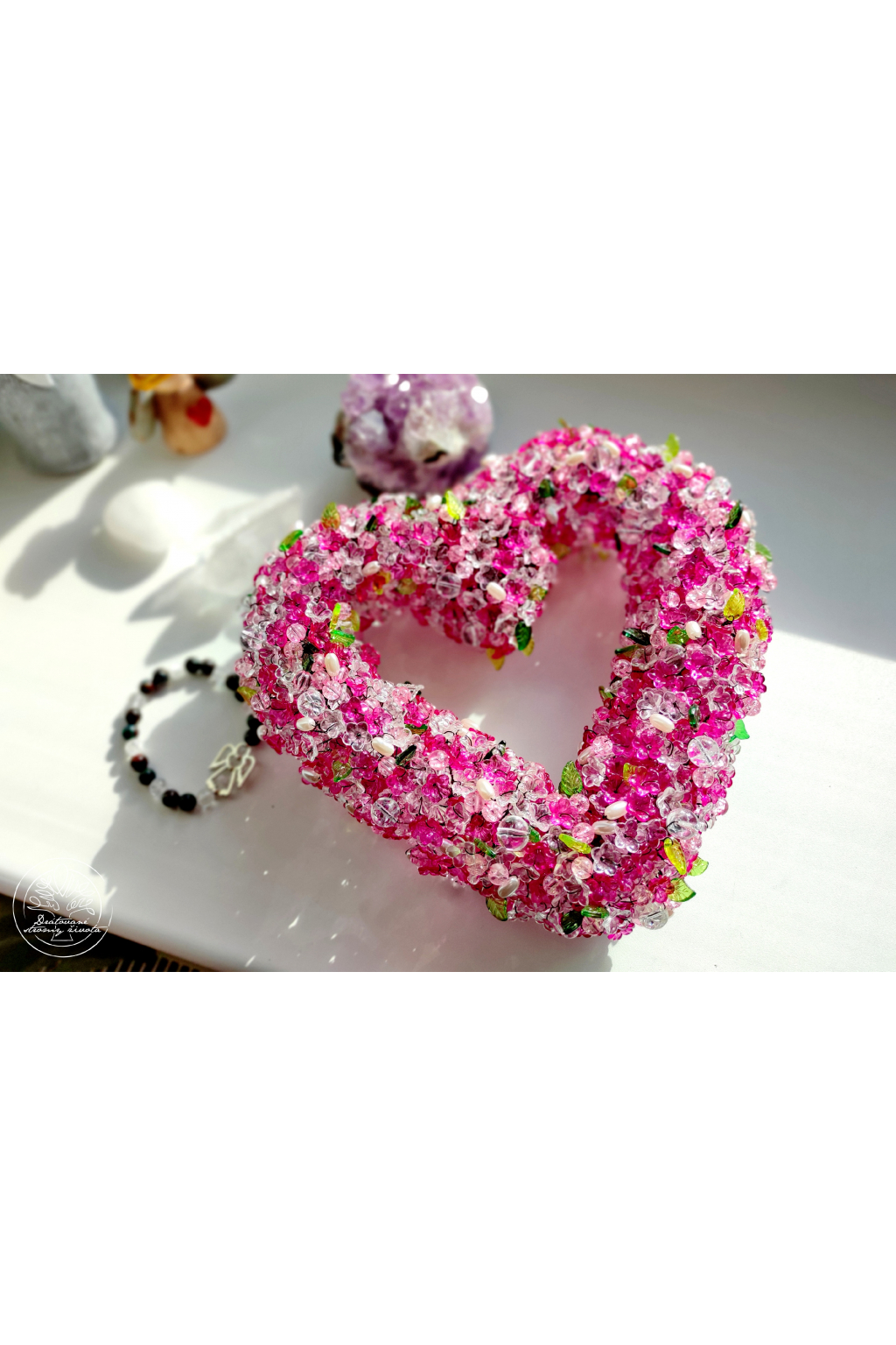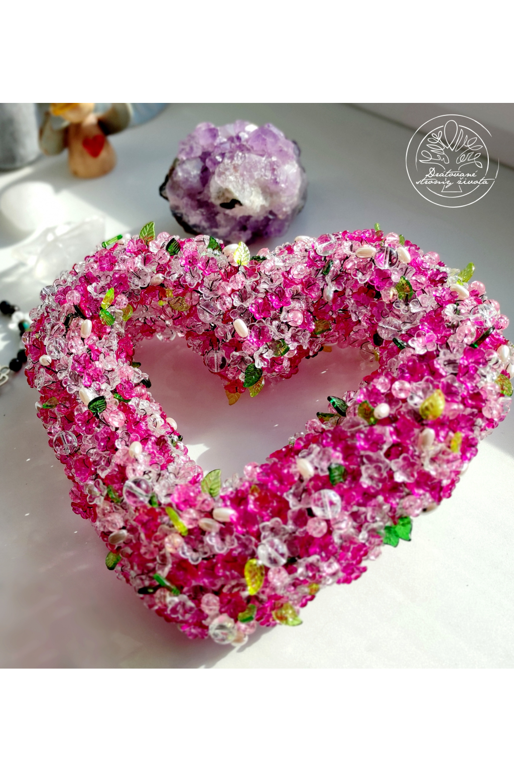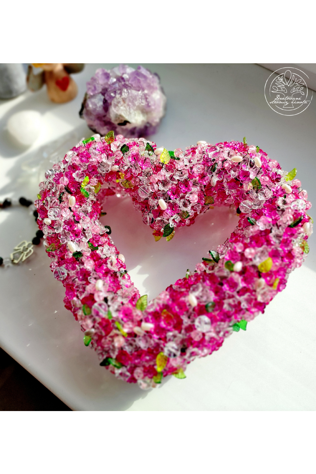 Drátované srdíčko s názvem "Laskavé srdce" , na němž je napleteno mnoho a mnoho kytiček, křišťálových kuliček, pravého křišťálu a perliček, doplněno o zelené lístky.
