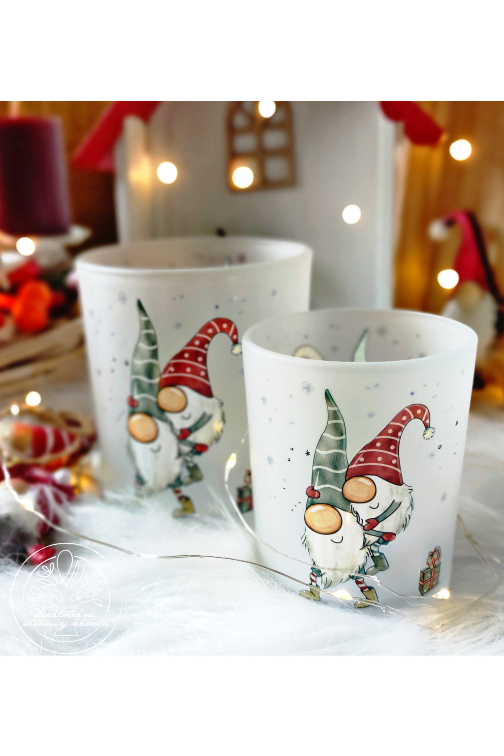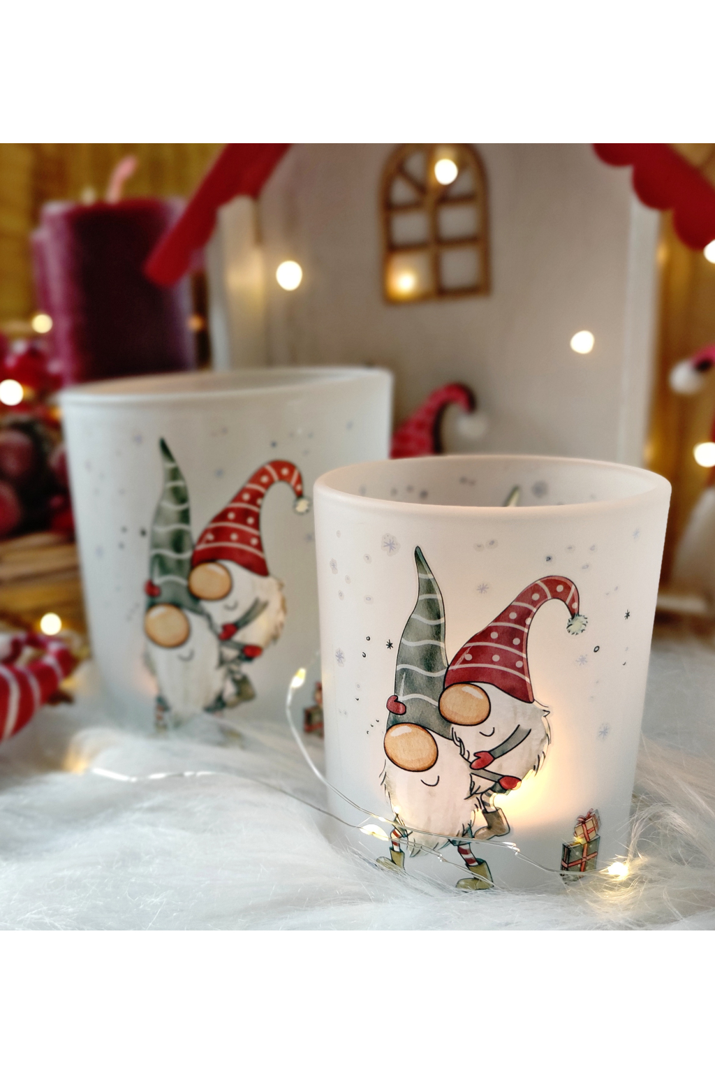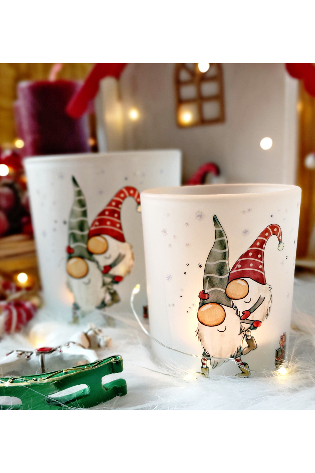 Vánoční skleněné lucerny set 2ks s motivem dvou skřítků ve stylu HYGGE, milý dárek, který potěší a vyčaruje pocit štěstí a pospolitosti. krásných chvil při zapáleném svíčce.