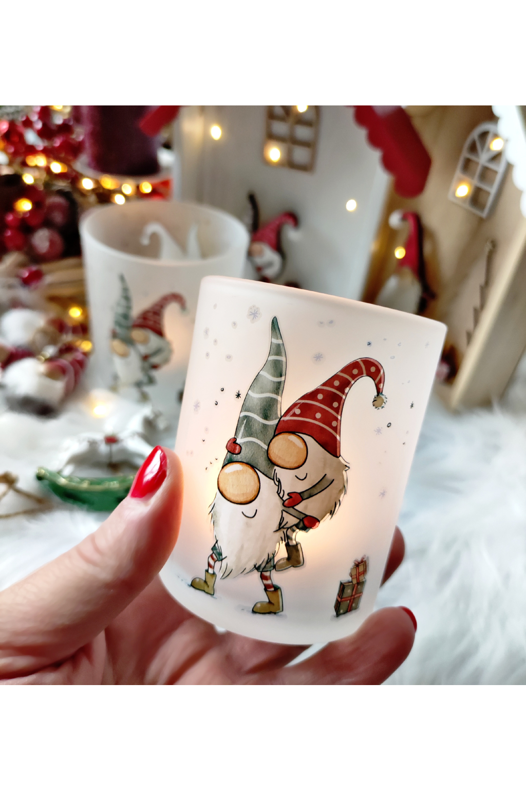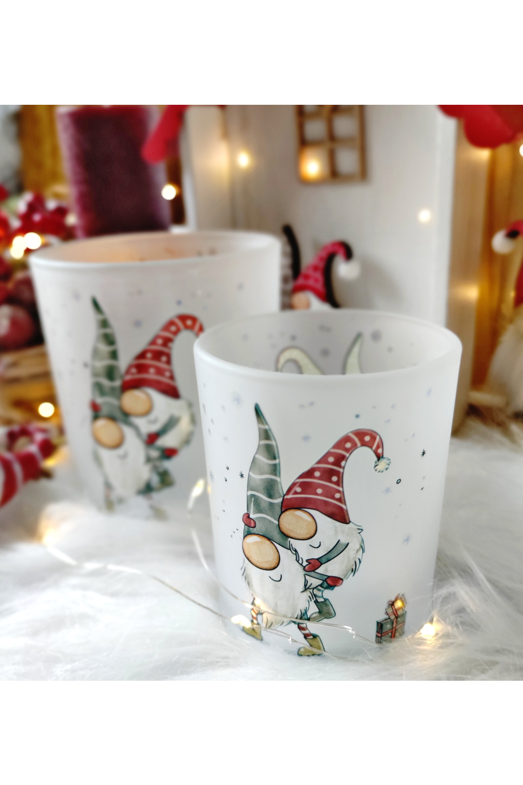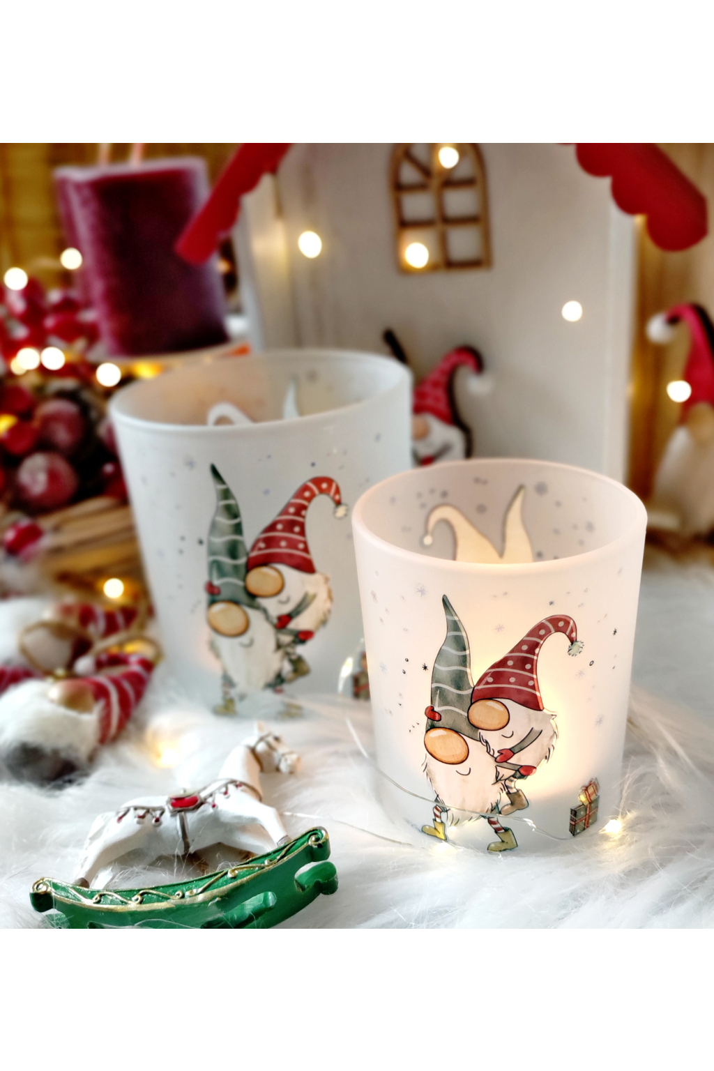 Vánoční skleněné lucerny set 2ks s motivem dvou skřítků ve stylu HYGGE, milý dárek, který potěší a vyčaruje pocit štěstí a pospolitosti. krásných chvil při zapáleném svíčce.