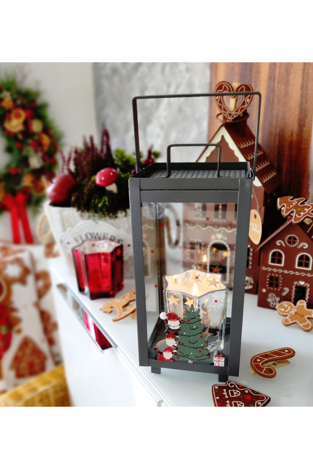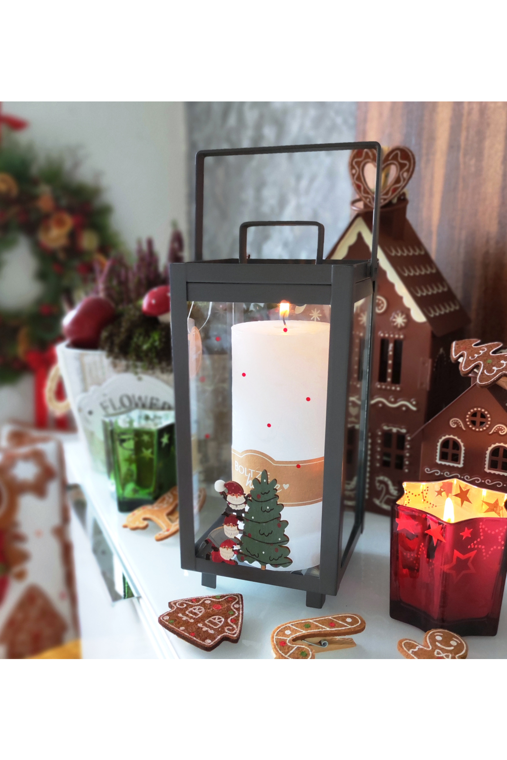 Motiv skřítka je oboustranný, lucerna má na sklech červené puntíky. Je prostě rozkošná.