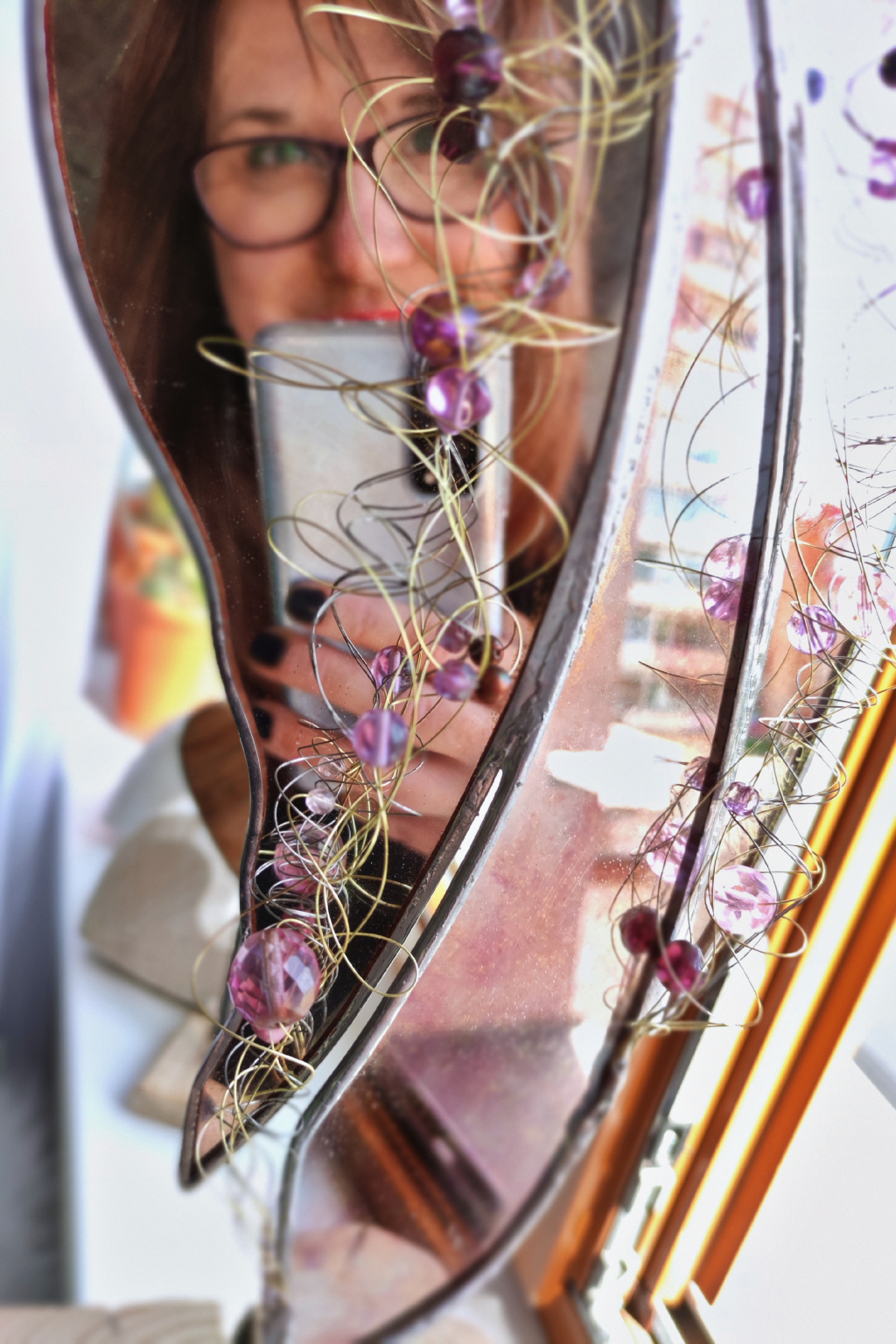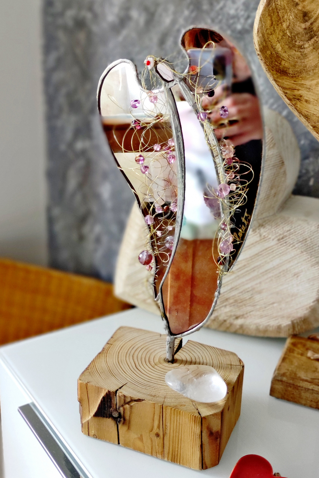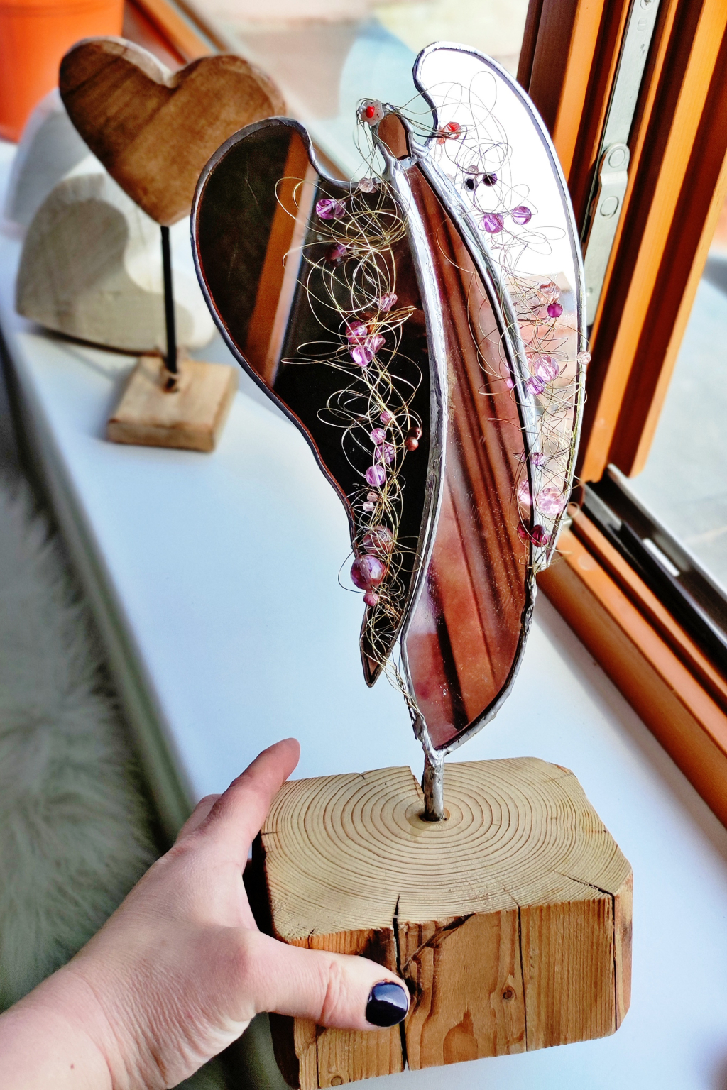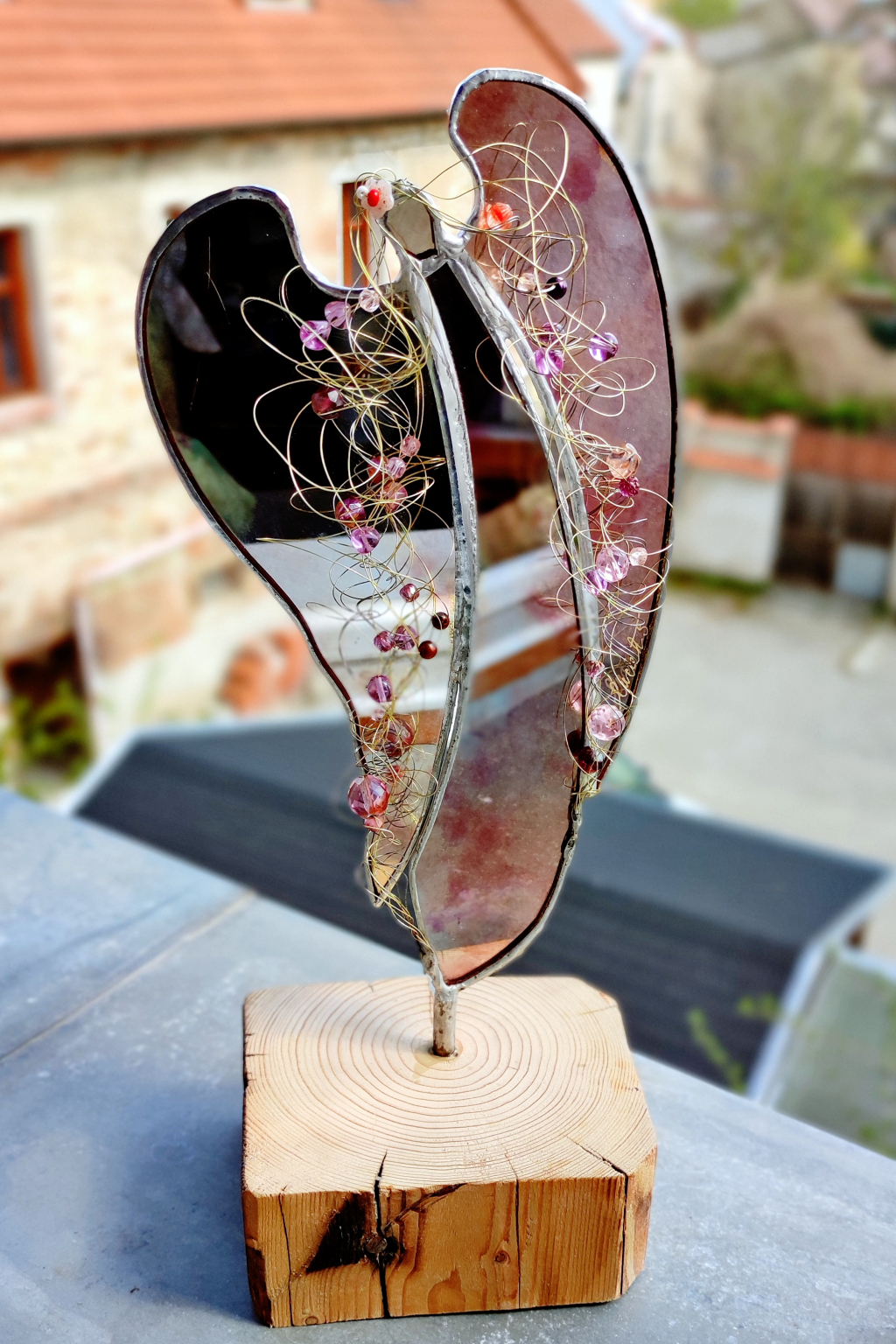 Ručně vyrobená velká LUXUSNÍ andělská vitráž Tiffany, vyrobená z růžového zrcadla, které je upraveno na vintage starobylou a oprýskanou verzi. Zrcadlo je starobyle upravené a vypadá, jako by jste našli na půdě zrcadlo po prababičce, dýchne na vás starou dobou a jemnou krásou zároveň.