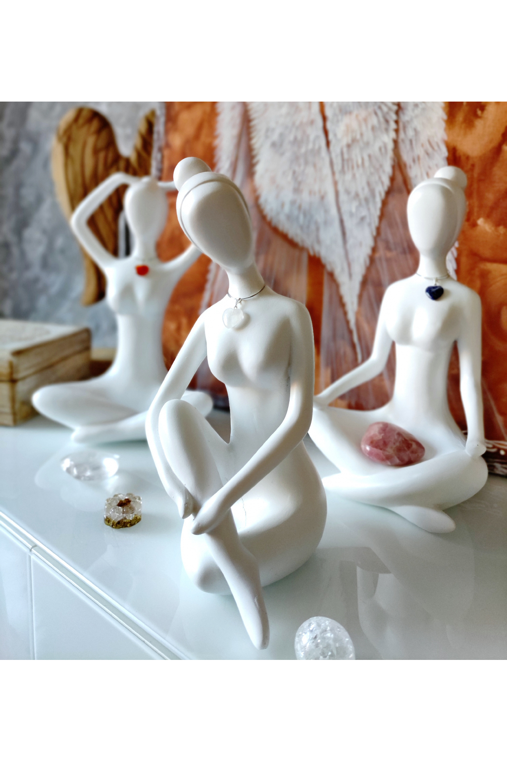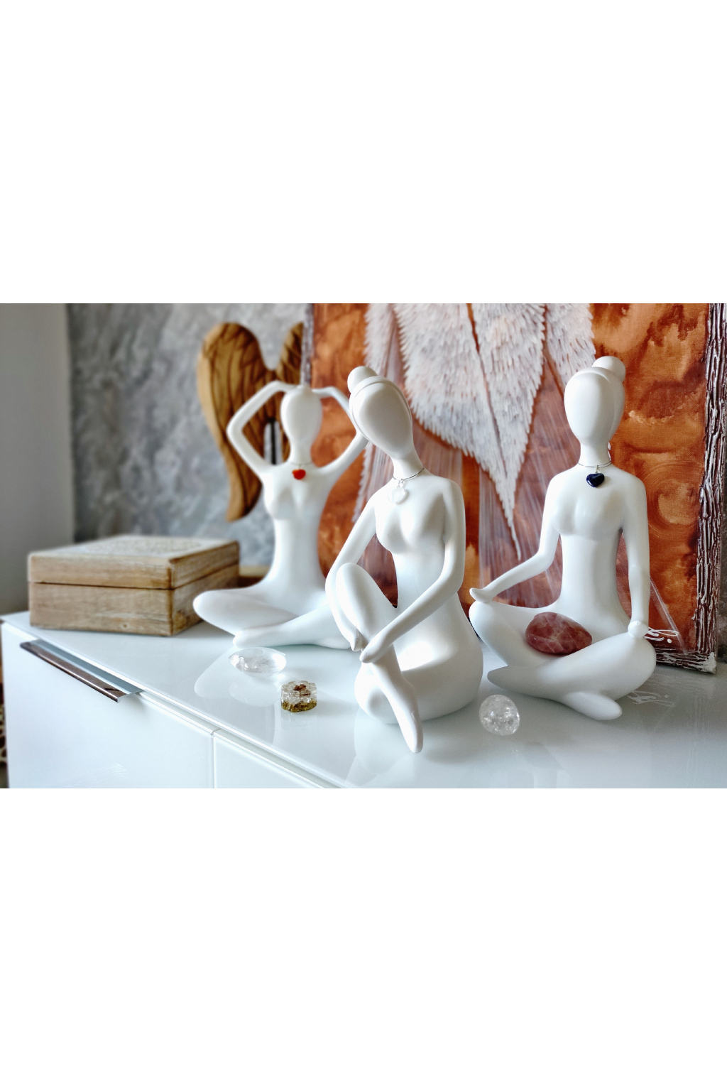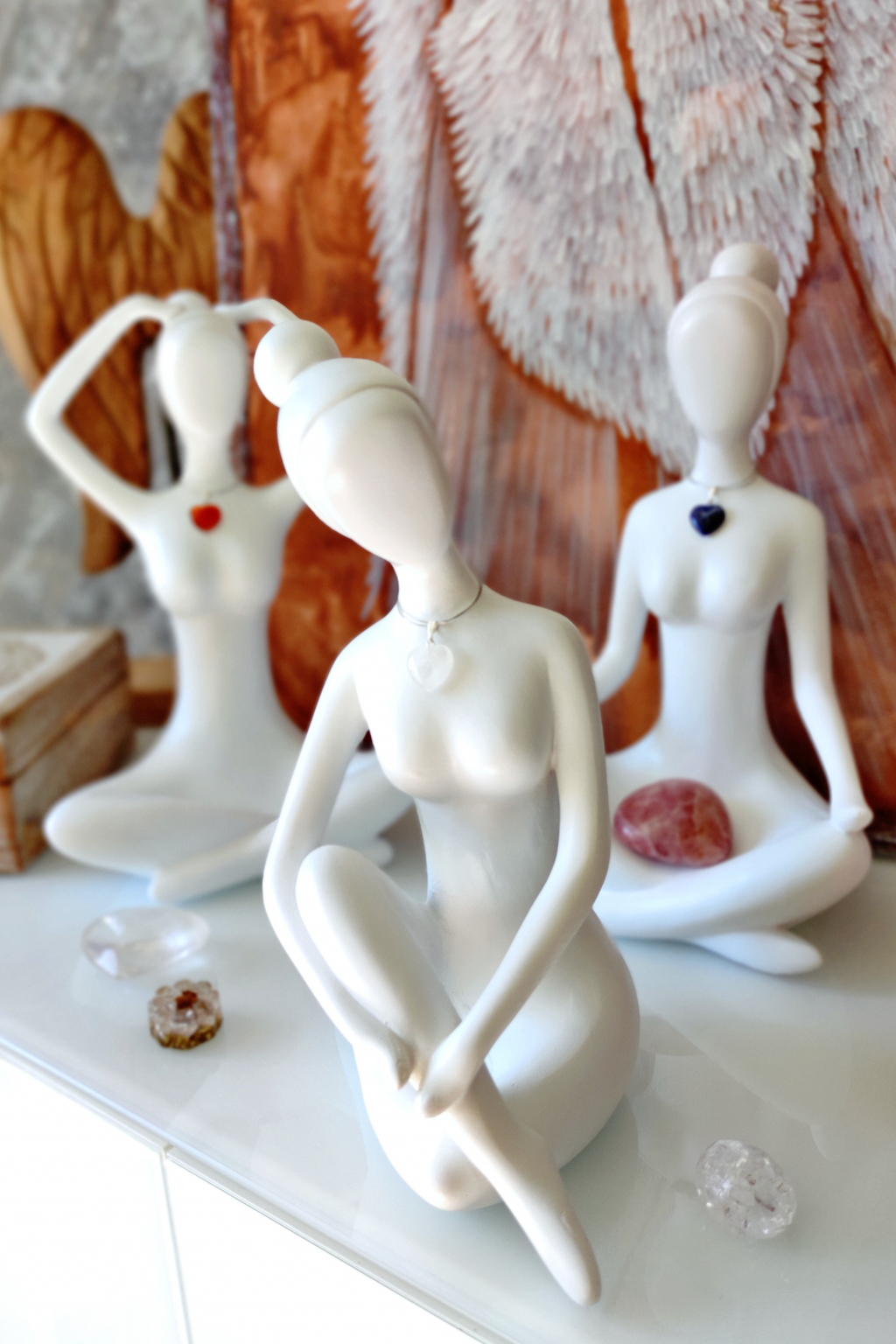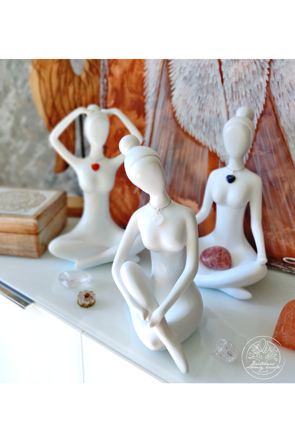 Soška meditující ženy s křišťálovým SRDÍČKEM pro velké a hluboké čištění našeho těla, srdce, duše i mysli, který je silně ochranný a očistný, má silnou moc odblokovávat vše, co sami neumíme odblokovat. Je kamenem, jež nás zbaví našich strachů a smutků a nabije nás radostí ze života.
