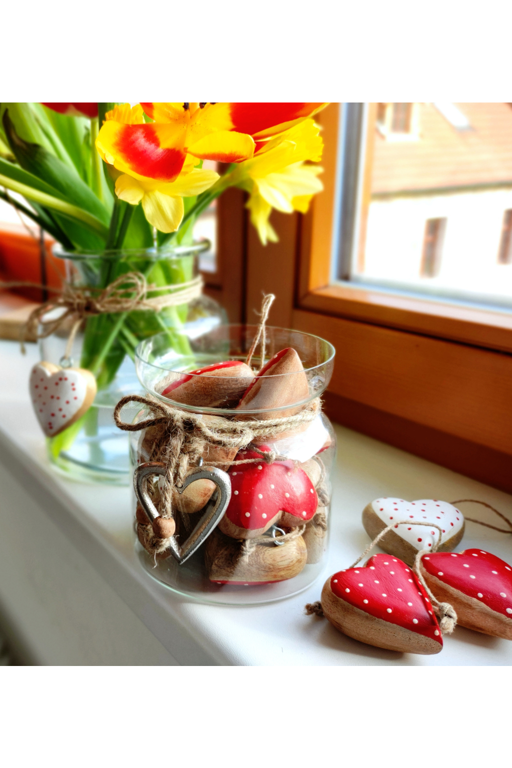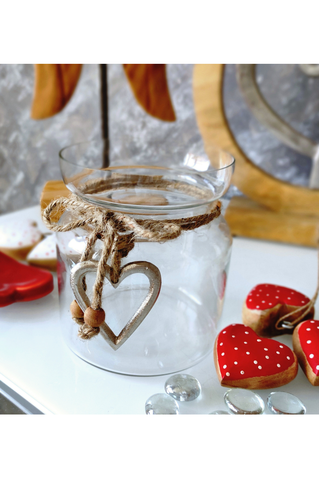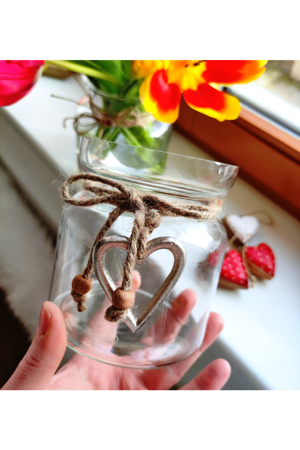 Je ozdobena přírodním jutovým provázkem, který je elegantně omotaný kolem hrdla a zavázaný do mašle. Na provázku visí milé kovové srdíčko, která působí jemně a rustikálně. Celkový vzhled této dekorace navozuje jarní a velikonoční atmosféru.