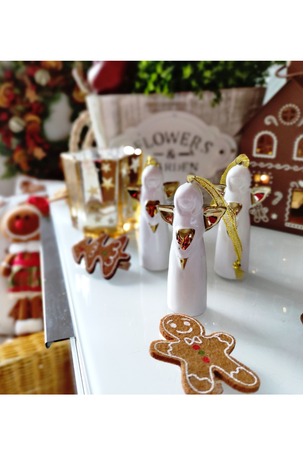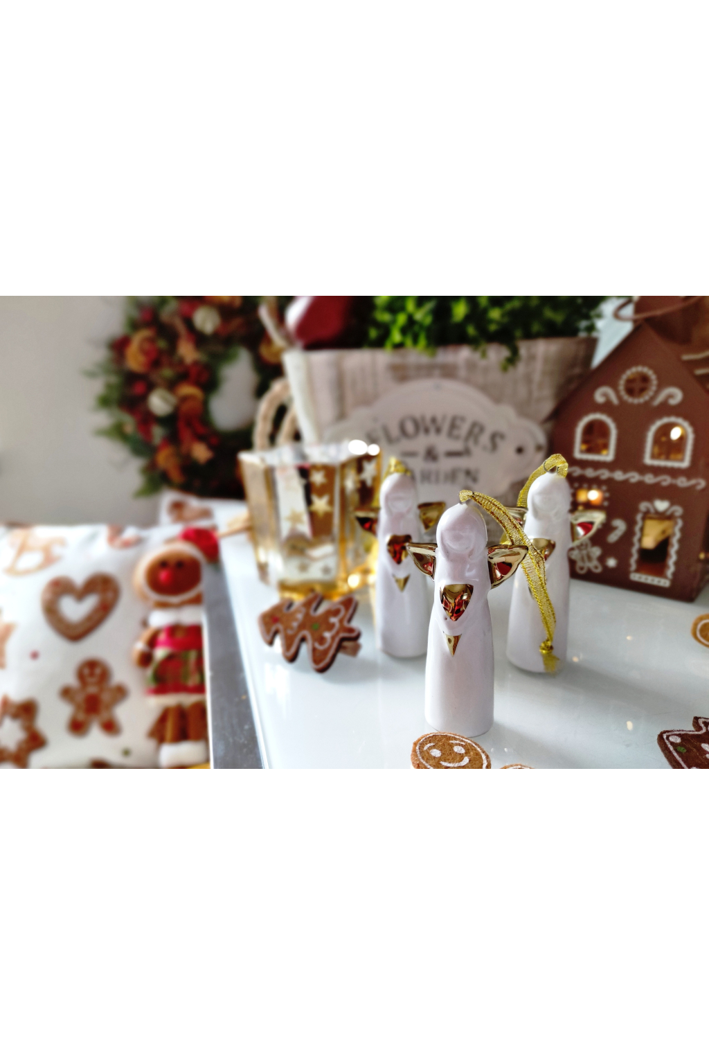 Set tří kusů něžných andílků ve světle bílé barvě se zlatou šňůrkou nesoucí v sobě poselství lásky a ochrany díky zlatému srdíčku, které svírá v náruči jako dar světla.