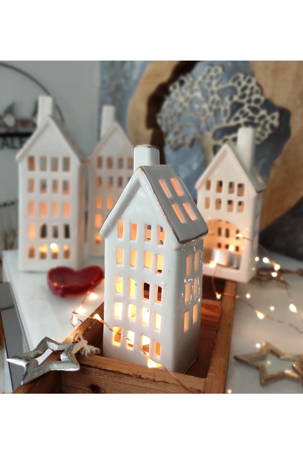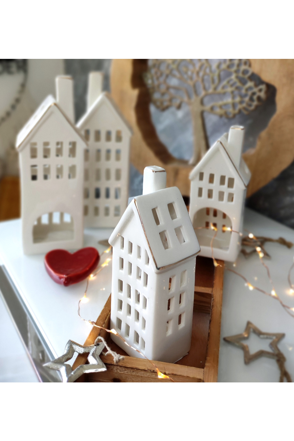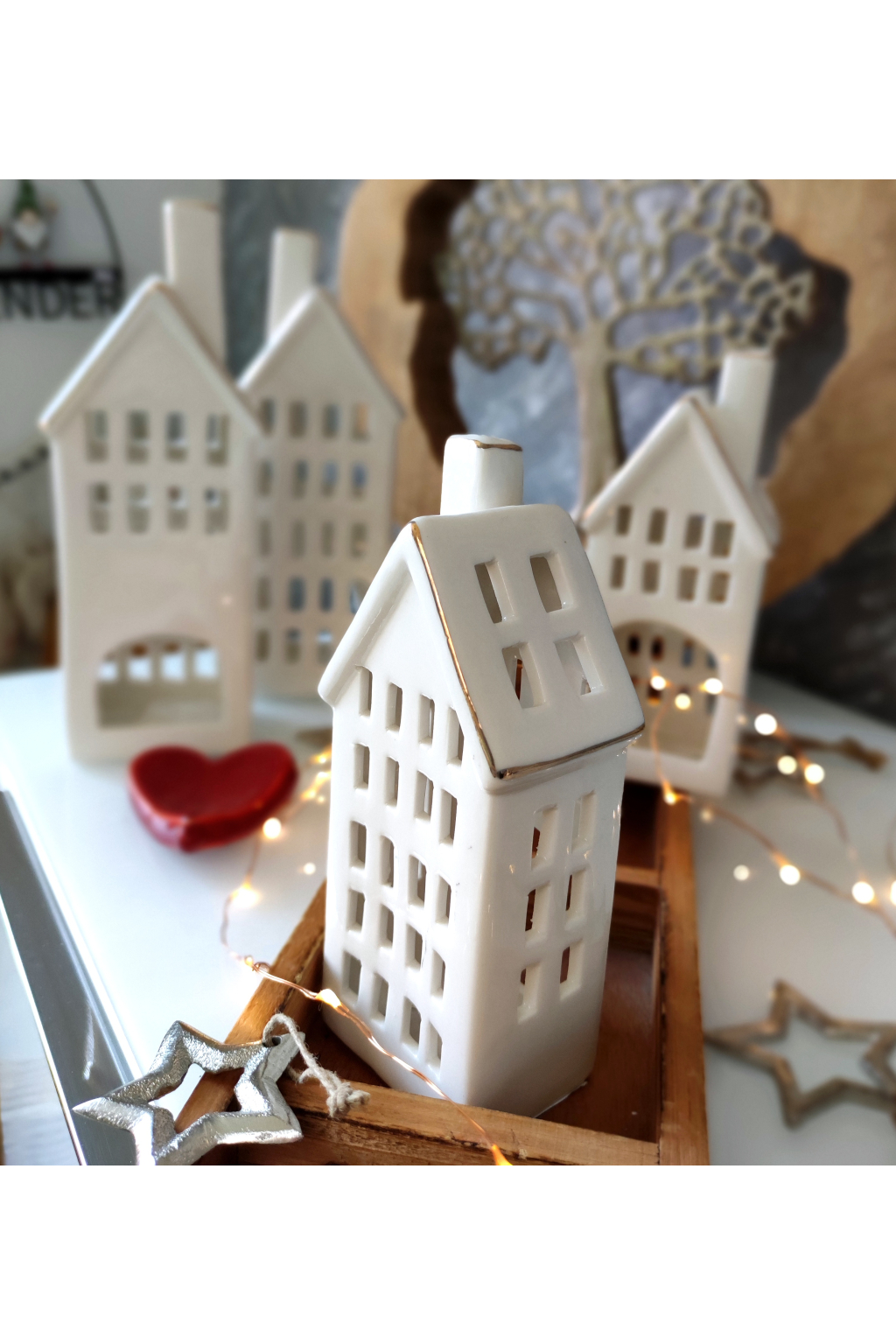 Krásný propracovaný porcelánový domeček v barvě bílá a zlatá, které vám mile doplní ostatní dekorace v tomto designu. Krásně spolu ladí se vším ostatním Zlato bílé vánoce.