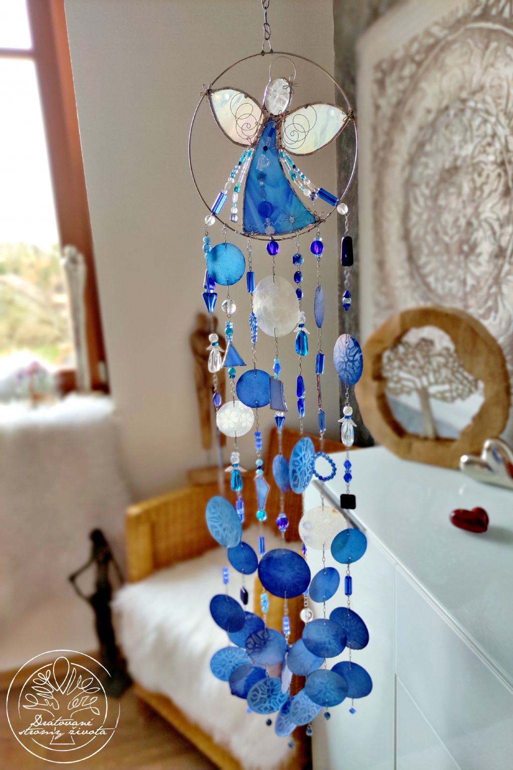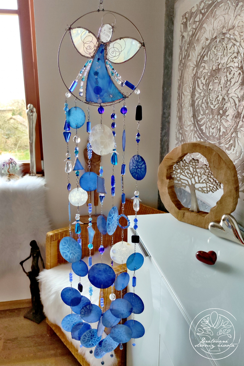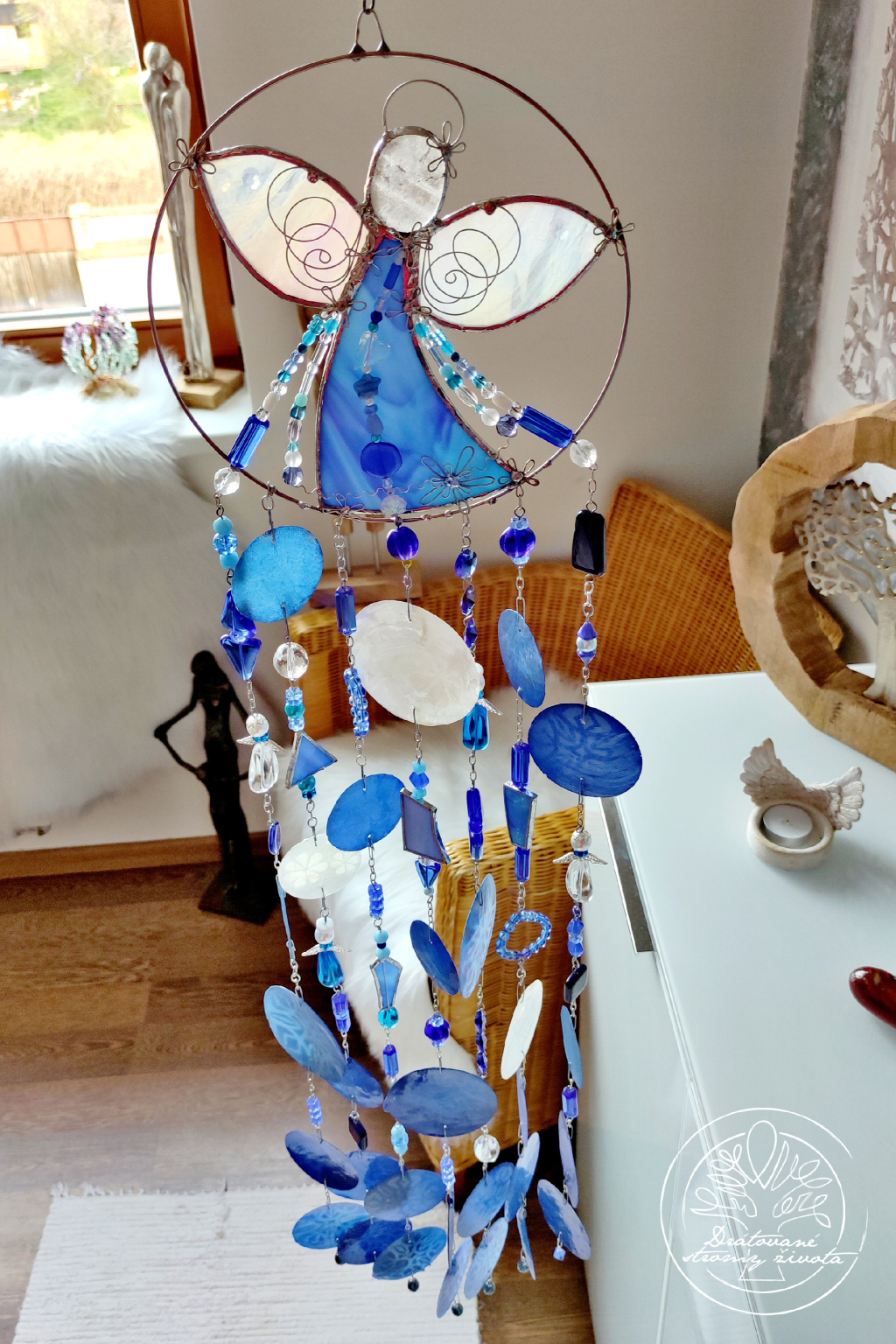 Andělská vitrážová cínovaná zvonkohra je s láskou ručně vyrobené, pracované technikou Tiffany - technika skleněných katedrálních oken.
