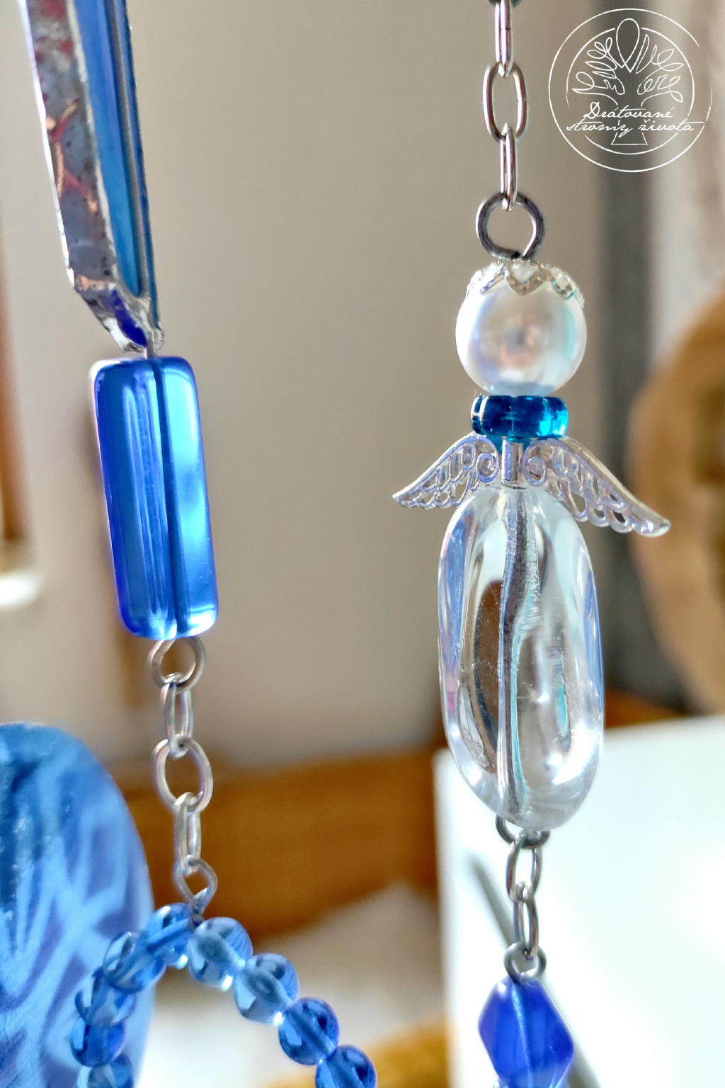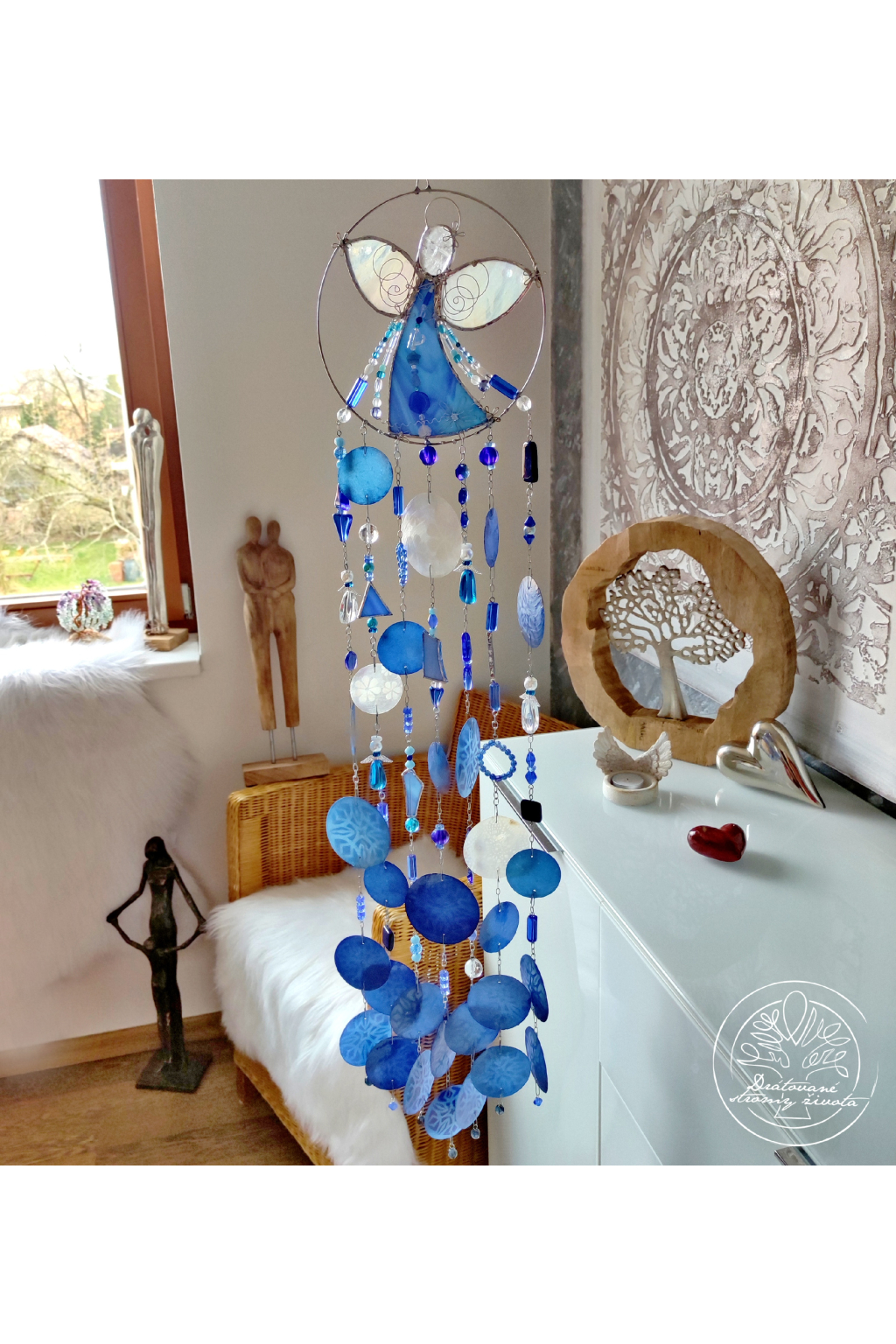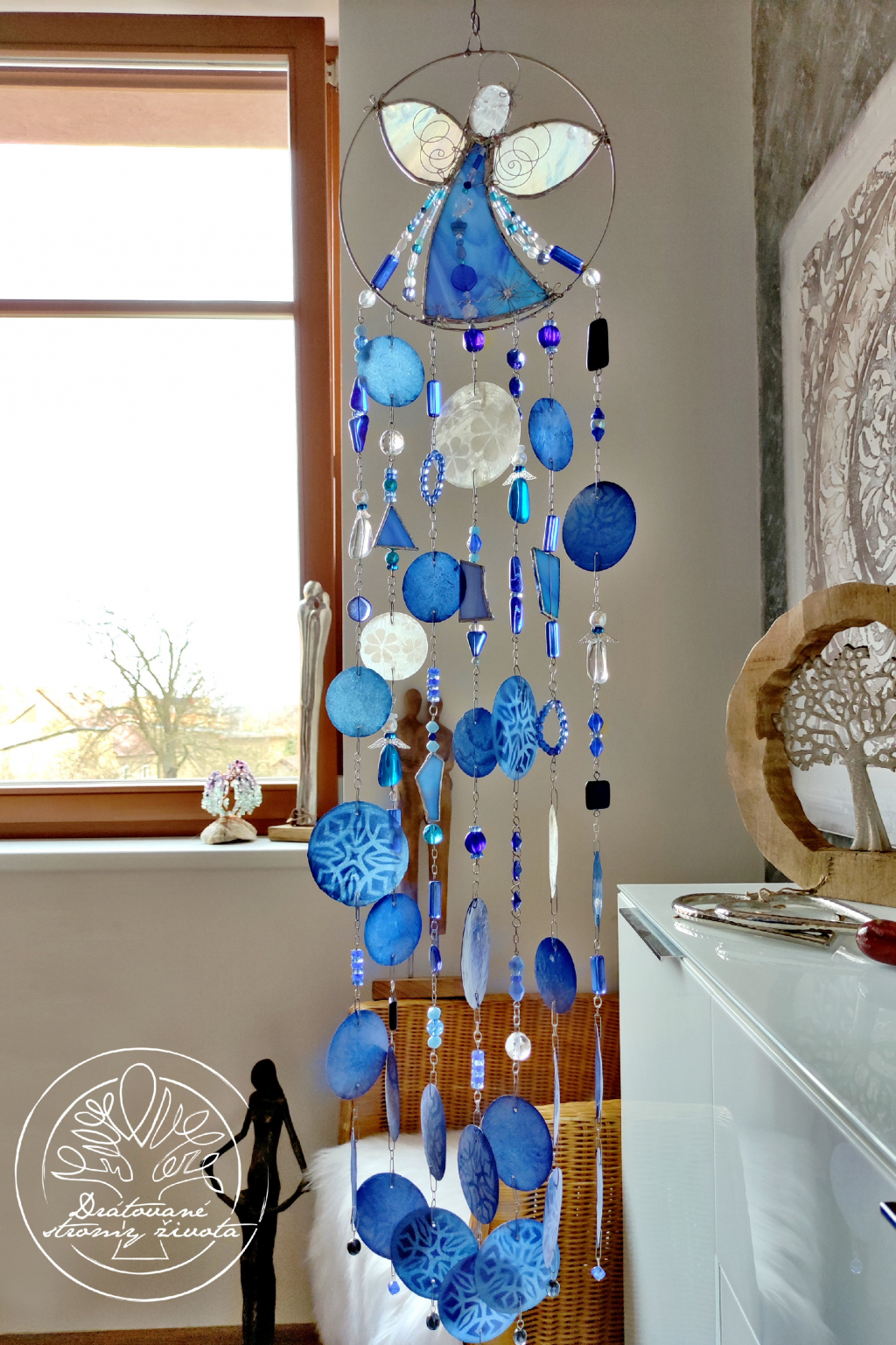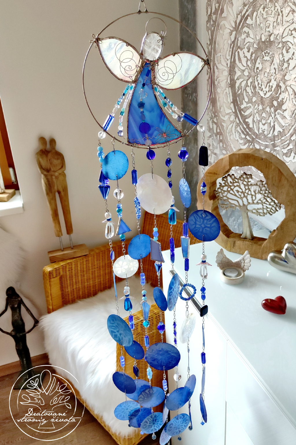 Andělská vitrážová cínovaná zvonkohra je s láskou ručně vyrobené, pracované technikou Tiffany - technika skleněných katedrálních oken.