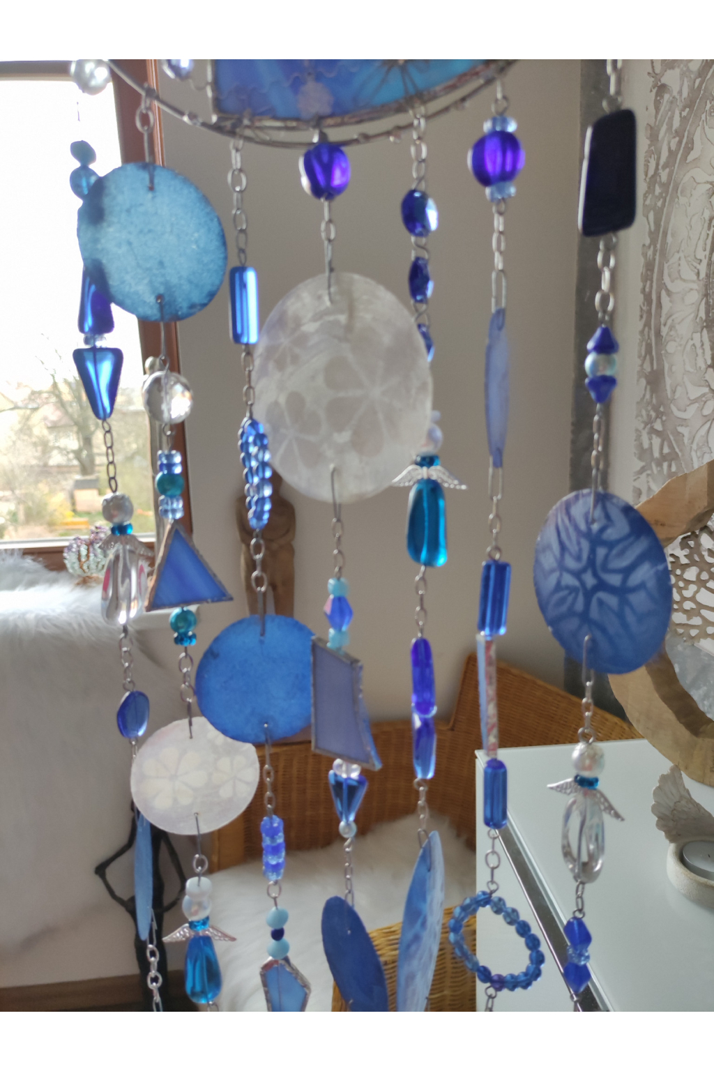 Tato něžná zvonkohra je vyrobena z 7mi proudů závěsů s perleťovými ručně malovanými kolečky s milými kvítky a rozličných ručně vyrobených komponentů na jejích dlouhých elegantních závěsech. Celková délka zvonkohry dosahuje k 80cm - je překrásně dlouhá.
