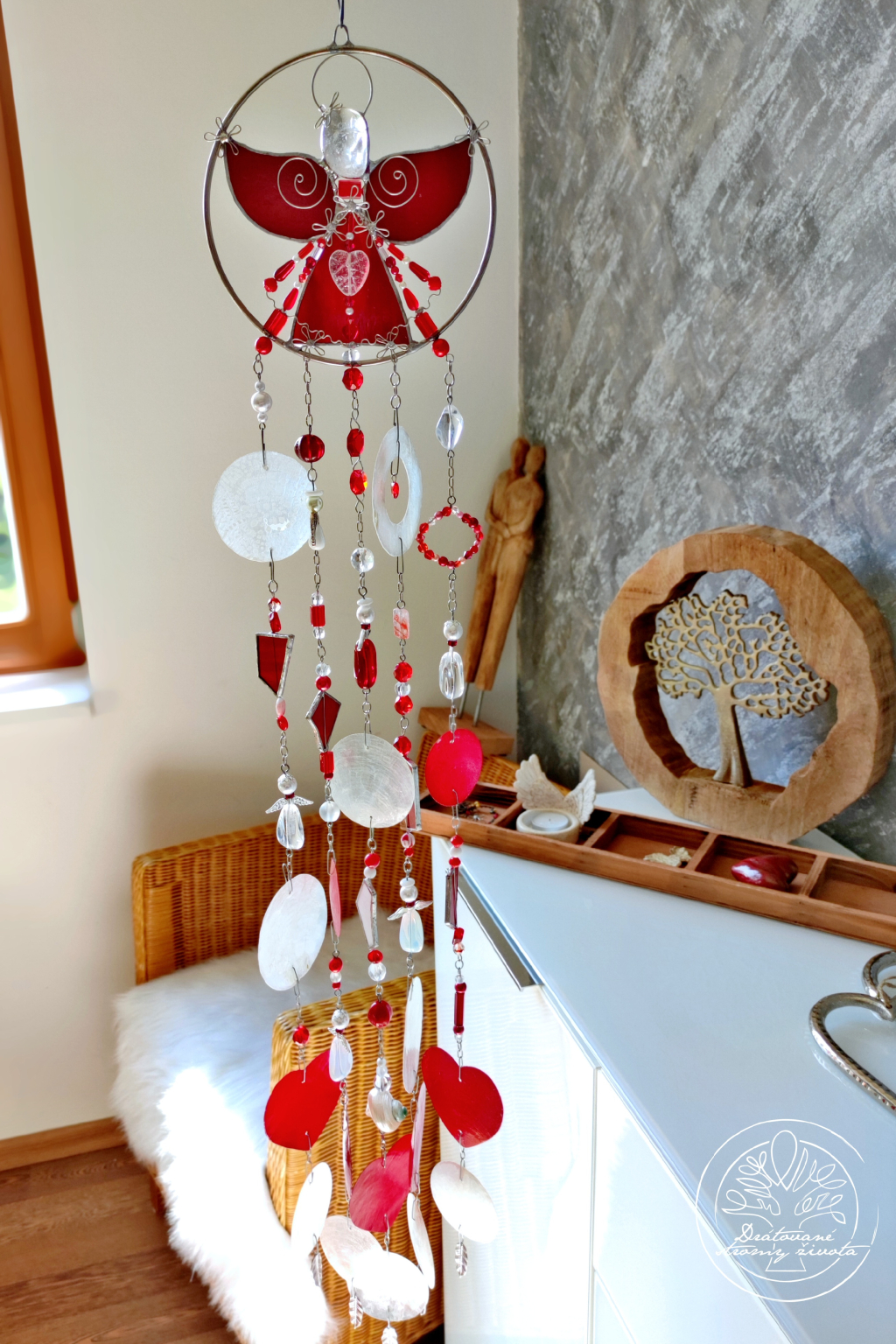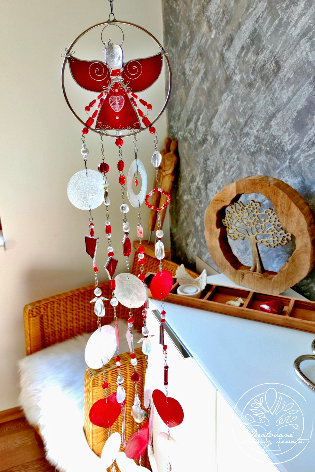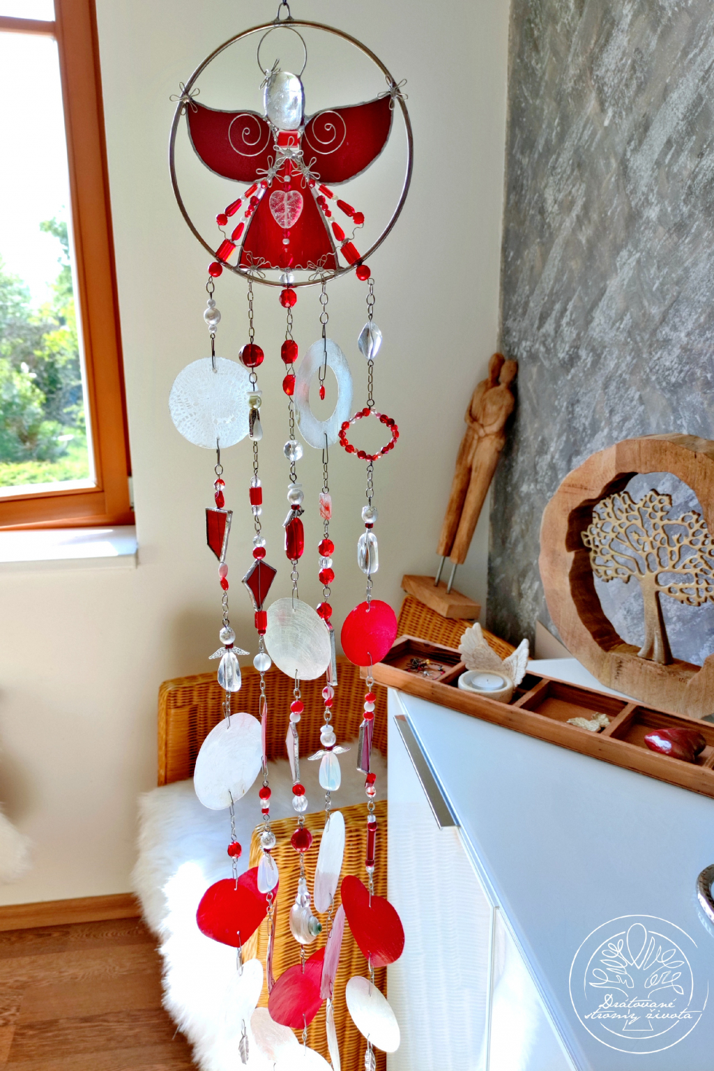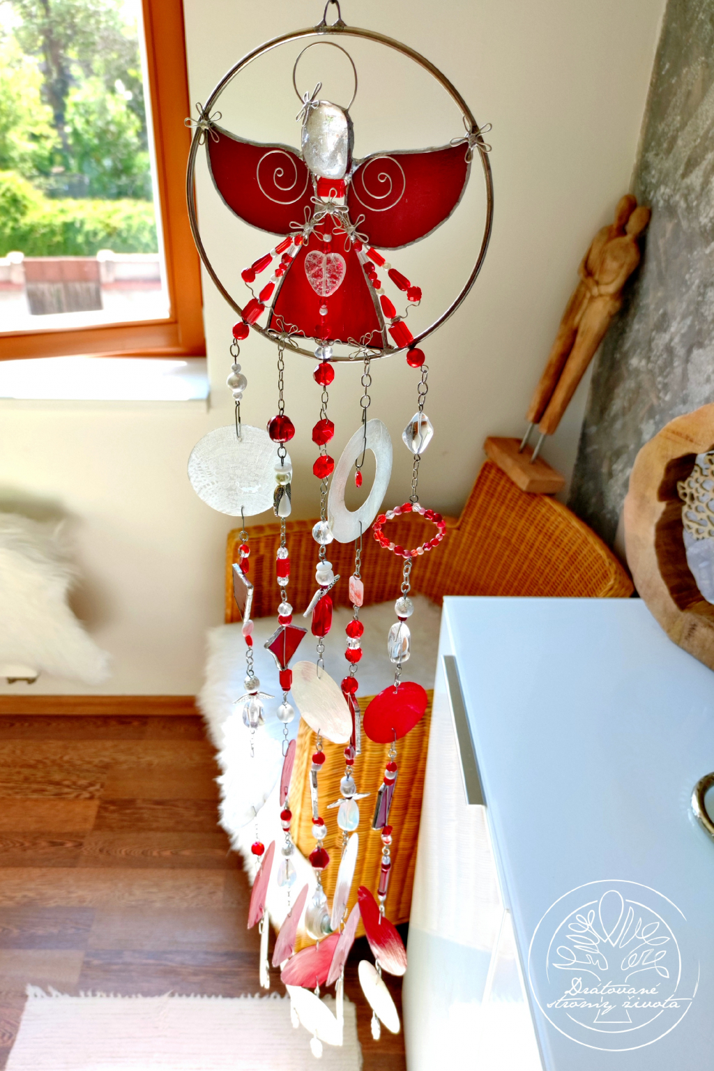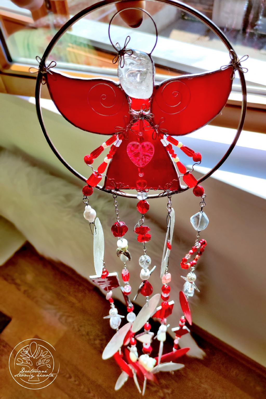 Andělská vitrážová cínovaná zvonkohra je s láskou ručně vyrobené, pracované technikou Tiffany - technika skleněných katedrálních oken.
