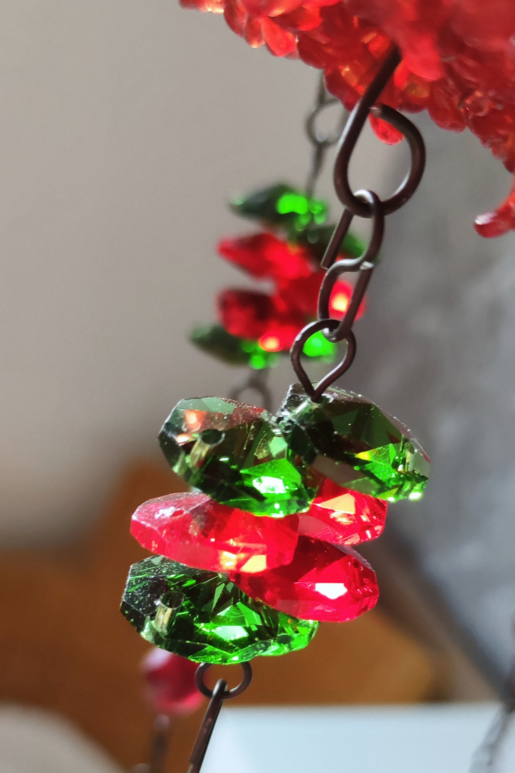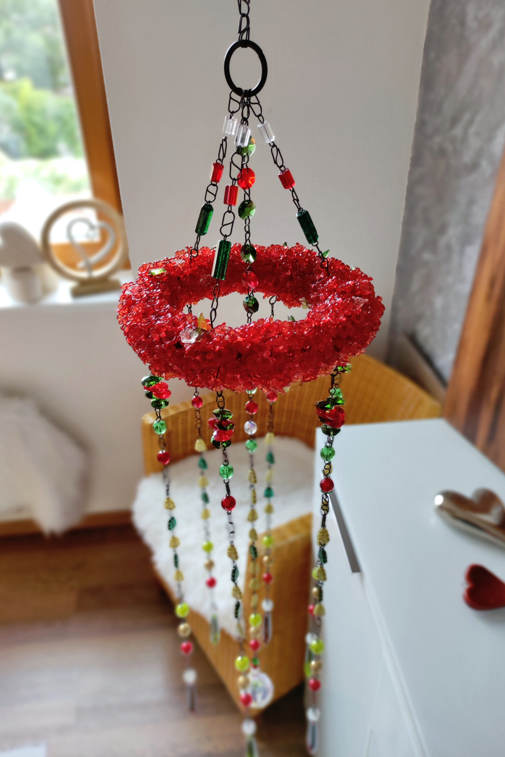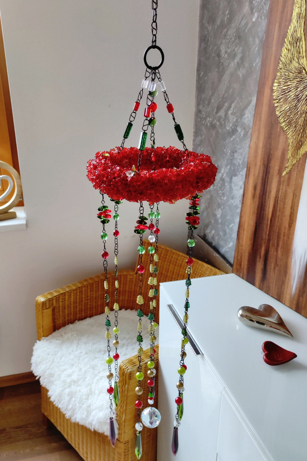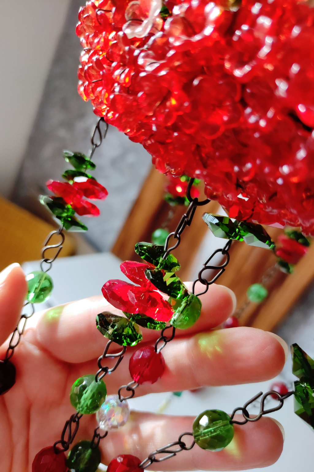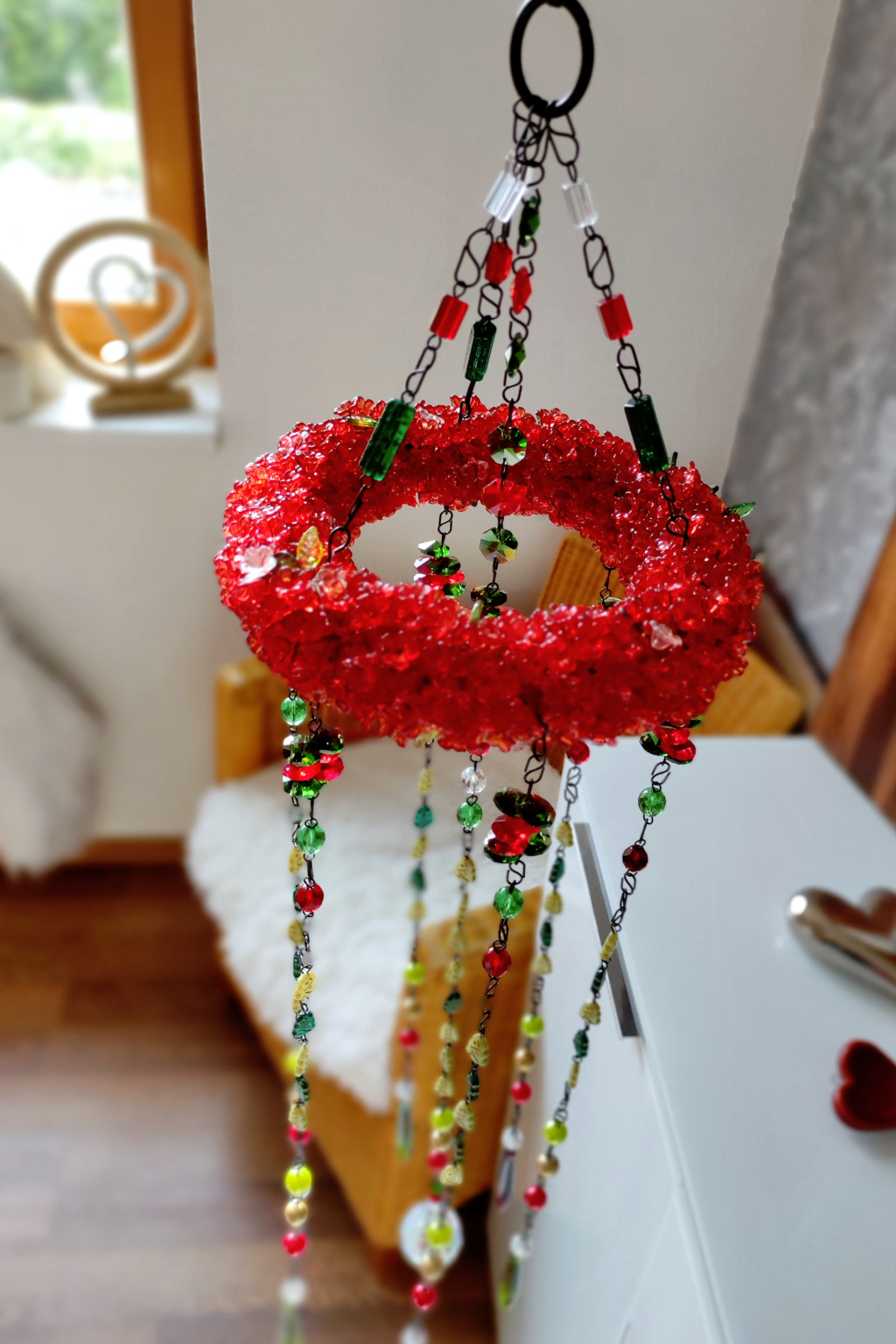 Tato vánoční korálková zvonkohra z naší kreativní dílny je originální dekorací, která dokáže rozzářit každý domov. Základem je ručně pletený věneček o průměru 18 cm, tvořený stovkami drobných korálkových kvítků. Každý květ je navázán samostatně na jemné drátky a postupně upevněn na drátěnou konstrukci, aby vznikla bohatá, pevná a třpytivá koruna v tradiční vánoční červené.