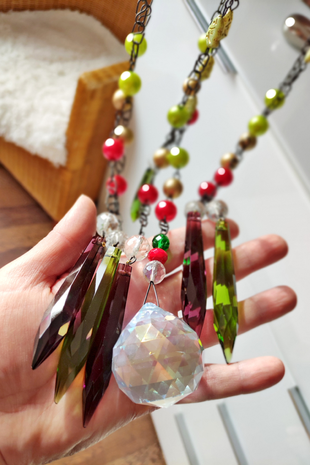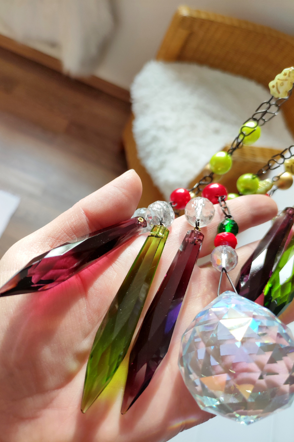 A uprostřed — jako srdce celé dekorace — je zavěšena broušená feng-shui koule. Zachytává každý paprsek světla, láme jej do drobných duhových odlesků a přináší energii harmonie a klidu. Díky ní zvonkohra nepůsobí jen jako dekorace, ale jako jemný nositel světla, rovnováhy a dobrého přání pro prostor, ve kterém visí.