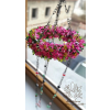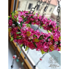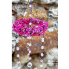 Věneček je zavěšen na dlouhém řetízku se skleněnými korálky, na středním závěsu je na konci velký broušený krystal feng shui. Laděn je do růžovo fialkových odstínů a je plastický a velmi plný - kvítky doslova posetý.